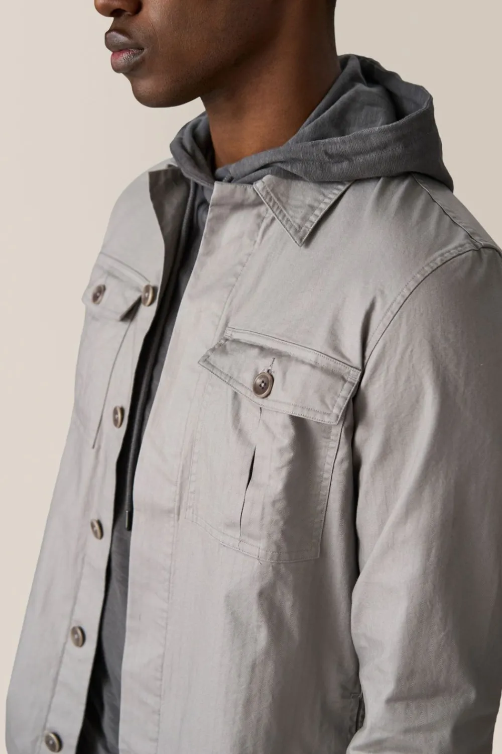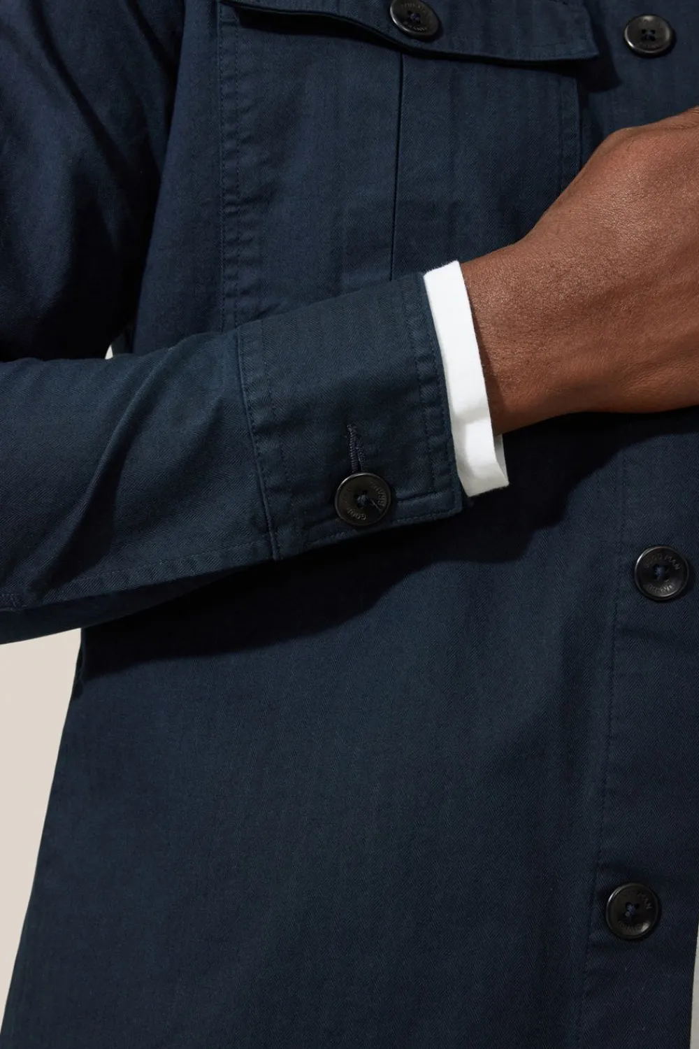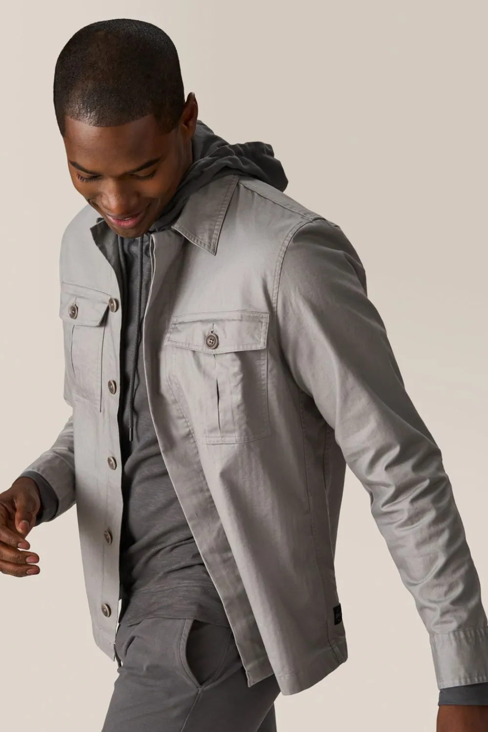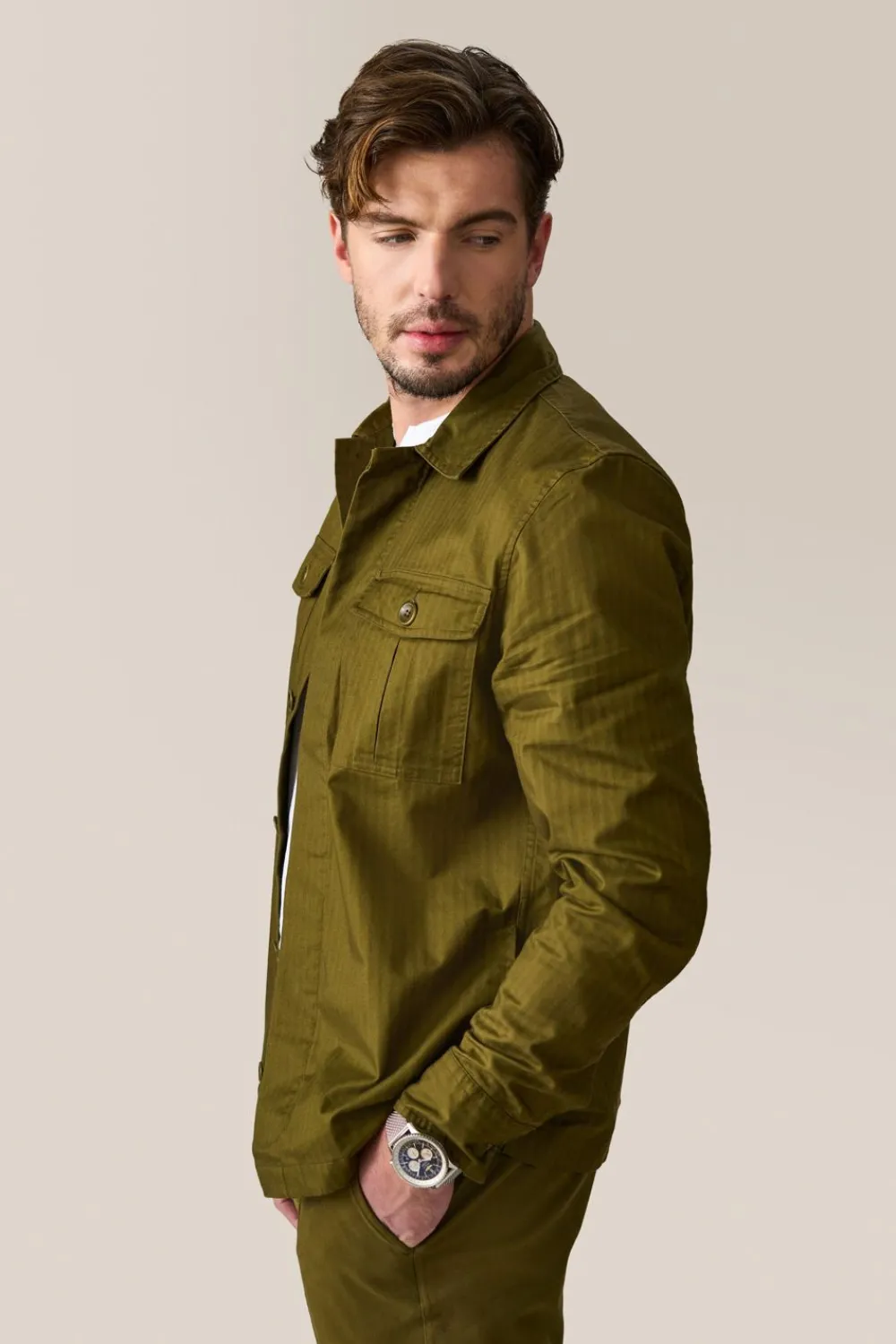 Military-Inspired Shirt Jacket In Chevron Woven Stretch Cotton Twill With Hidden Button Front Placket, 2 Inverted Pleat Patch Pockets, And On Seam Side Pockets For Convenience.