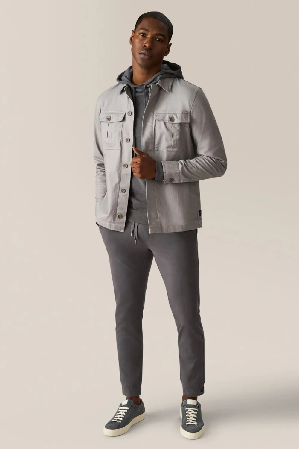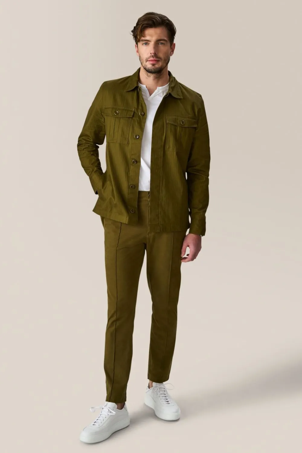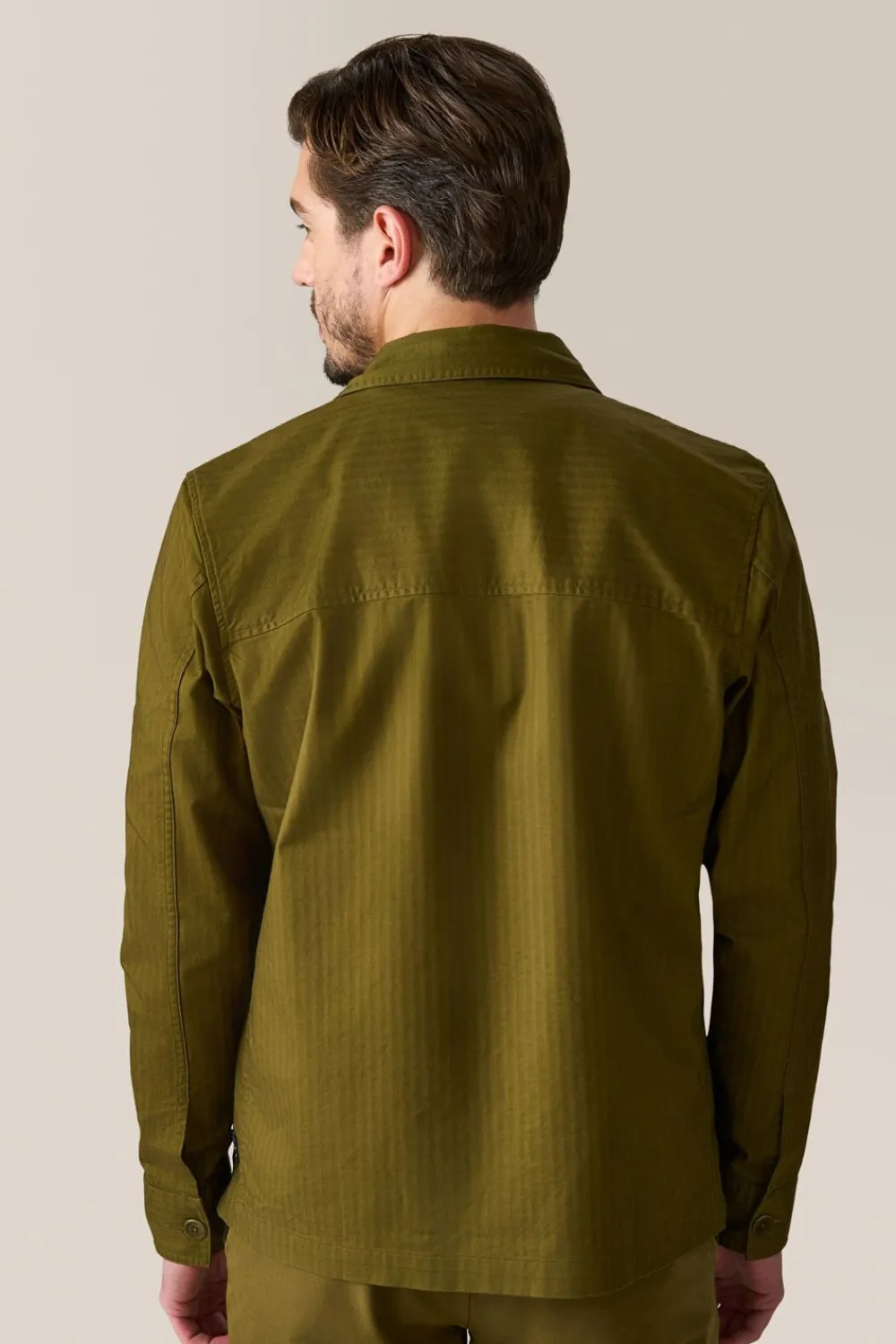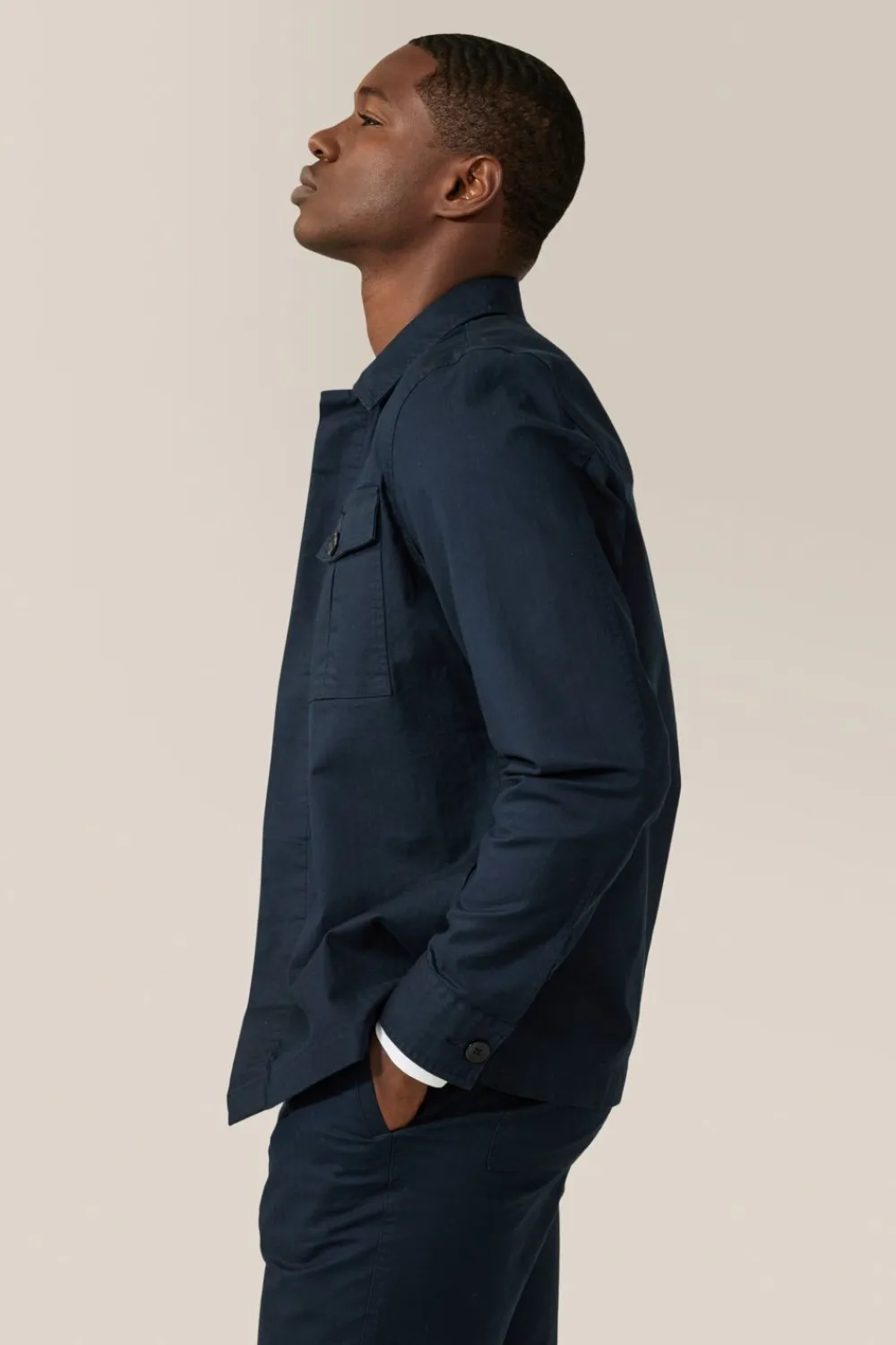 Military-Inspired Shirt Jacket In Chevron Woven Stretch Cotton Twill With Hidden Button Front Placket, 2 Inverted Pleat Patch Pockets, And On Seam Side Pockets For Convenience.