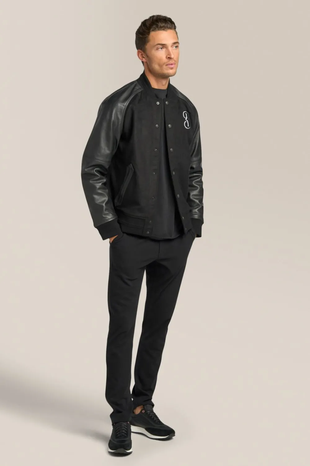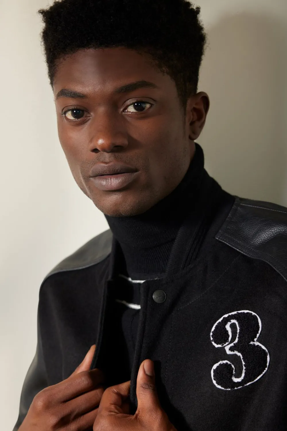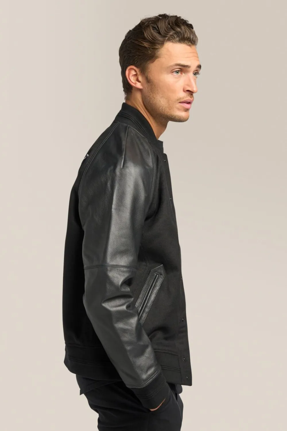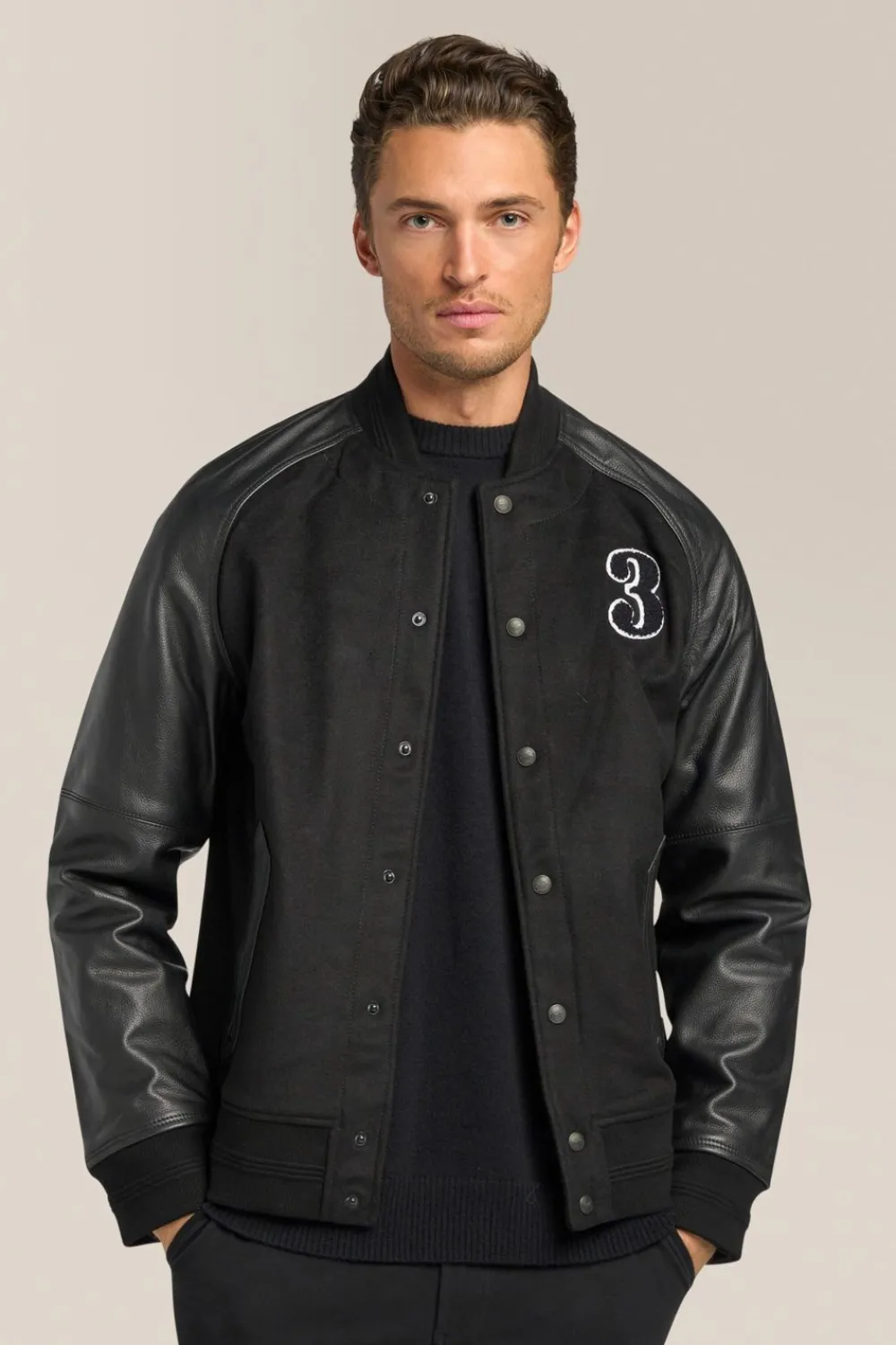 A Statement On And Off The Field. The Classic Varsity Jacket Is Modernized With A Textured Wool Blend Body, Responsibly Sourced Pebbled Leather Sleeves And Front Angled Pockets Tipped In Leather.